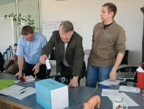 Abstimmung über die Kandidatenliste für den Köthener Stadtrat - von links: Wolf Eckart, Jörg Rosenkranz und Versammlungsleiter Ronny Schneider. (BILD: Claus Blumstengel)