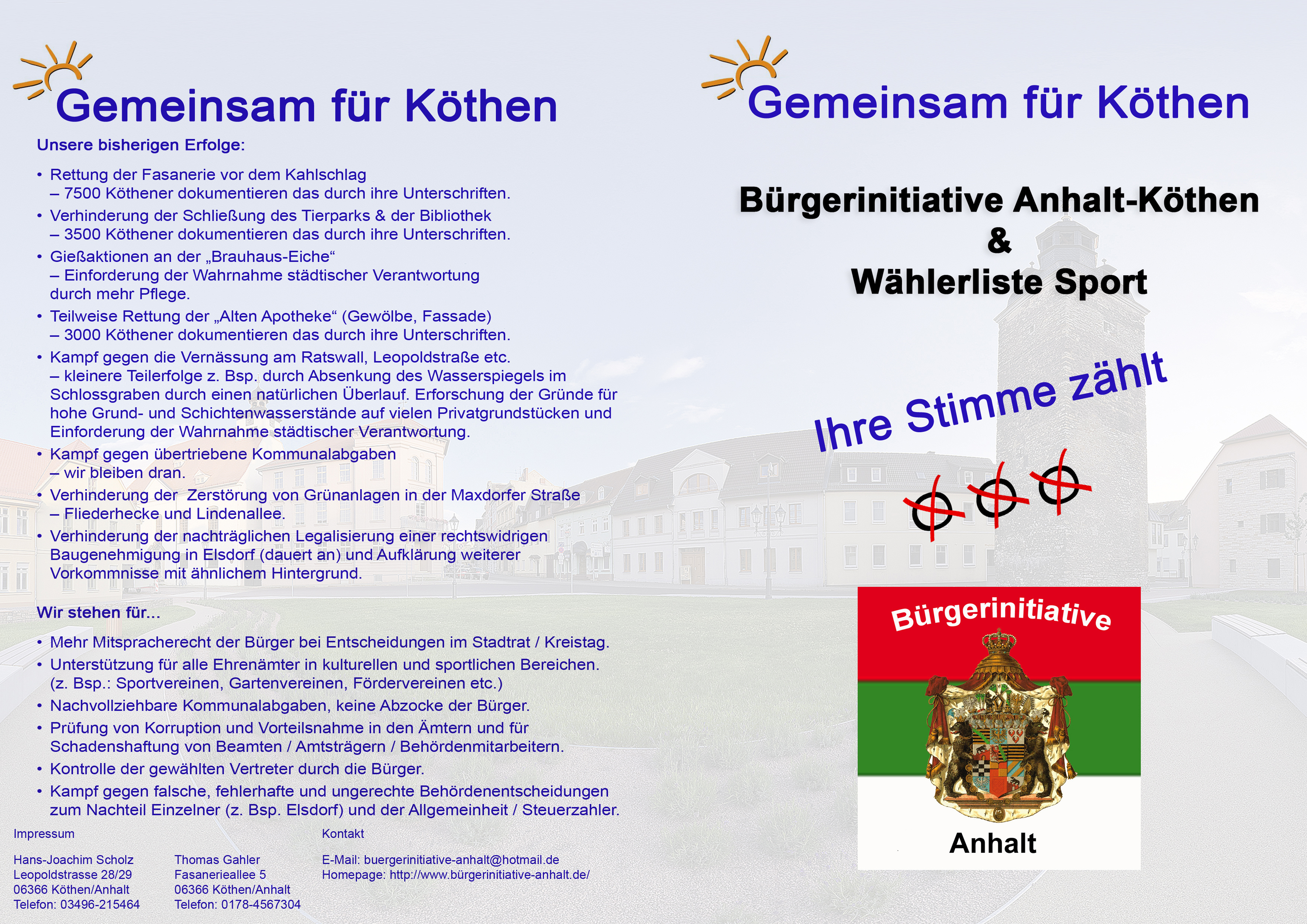 Die Themen Sport- und Nachwuchsförderung sowie der Kampf gegen Einsparungen auf diesem Gebiet stehen bei der Wählerliste Sport an oberster Stelle. Die Bürgerinitiative Anhalt-Köthen, die mit Spitzenkandidat Thomas Gahler antritt, hat sich die Schwerpunkte „Vernässung“, „ausgeglichener Haushalt“, „Transparenz von Entscheidungen“ sowie „stärkere Bürgerbeteiligung“ auf ihre Fahnen geschrieben. Wie ihr Sprecher Hans-Joachim Scholz gegenüber der MZ betonte, lege man ebenfalls Wert auf eine schlanke, kompetente Stadtverwaltung. „Bis jetzt gibt es dort niemand, der solche Zusammenhänge wie zum Beispiel den Einfluss des Schlossgrabens auf das Grundwasser erkennt“, bemerkte Scholz.